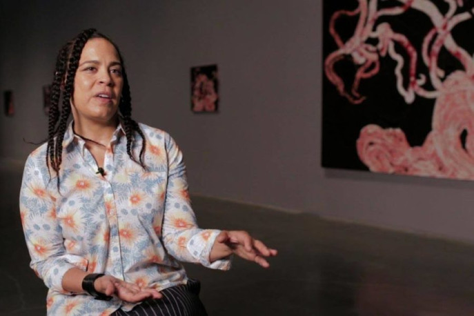 Drawing from a vast archive of cultural references, the artist Ellen Gallagher uses a cartoon-like style to highlight pervasive, exaggerated, and pejorative caricatures of African Americans. She also often complicates her paintings with textual references, such as lines of Emily Dickinson’s poetry. Judith Wilson succinctly argues that Gallagher melds image and text precisely in order to question both that cultural archive and the history of cultural amnesia about it.