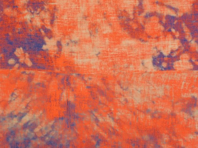 Painters and paint-lovers should flock to Evan Nesbit’s (NAP #99) current show /ˈkaɪˑæzəm/. Entering Roberts & Tilton, visitors are met by a group of large and brightly colored burlap canvases. The combination of acrylic paints and dye on brown burlap and of Nesbit’s painting on the opposite side of the burlap than the one facing outward has a contradictory effect on the colors: they are muted bolds and conversely, they are bright pastels.