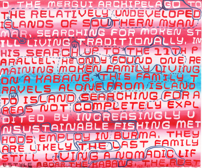 Ellen Caldwell: In your recent series “Flood,” you juxtapose Internet commentary following an article about the alleged decline of the nomadic Moken people of Myanmar with biblical verses about Noah’s epic. These seemingly chance parallels of texts end up aligning quite beautifully and tragically in exploring the current state of both our environmental and personal communicative degradation. Highlighting the comment section of our media is so interesting to me, because I think we often see a real break down of humanity there. Could you speak to this a bit?