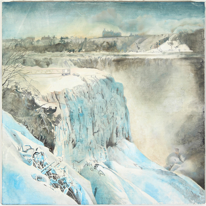 Rebecca Bird’s painting show “Niagara Falls” at Kopeikin Gallery is compelling and beautiful. The show features a mix of delicate watercolors on paper and equally fragile acrylics and oils on wood. Something about the balance between the very subtle nature of her works combined with the hard, angular movements within her details compelled me to contemplate and wonder.