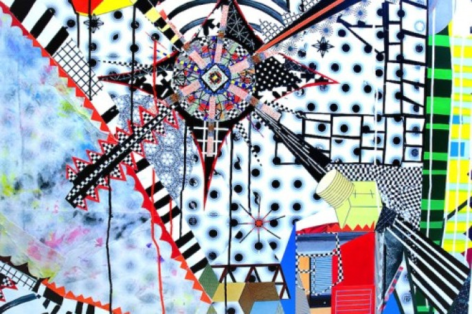 Brian Porray’s (NAP #84 & 2010 MFA Annual) second solo exhibition at Western Project is quite simply a must see and must feel. He fills the large, open gallery space with his signature bright and bold explosions of color, movement, and energy. In his last show, he focused on capturing the essence of his hometown Vegas and the complex power of the Luxor Hotel, and in this show, he moves to something else just as unsettling and unnerving as sin city can be to some – the ever-changing and impermanent night sky and the sci fi terrors and wonder it can bring to us mortals.