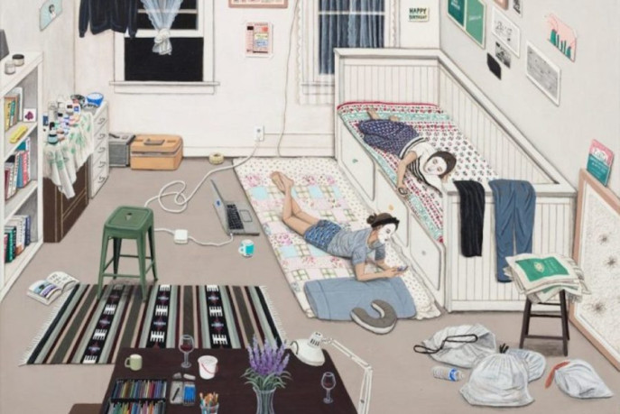 In Ko’s Old Apartment, Moon portrays intricate details to offer a glimpse into a friend’s hangout and an artist’s life. We see two young women lounging with face masks on, atop one twin bed and one makeshift bed on the floor, as if mid-sleepover. And we also see clues into an artist’s life, as Ko’s tools are embedded around the room — a set of colored pencils on the desk along with a glass of paintbrushes in the foreground and a shelf with paints in the background…
